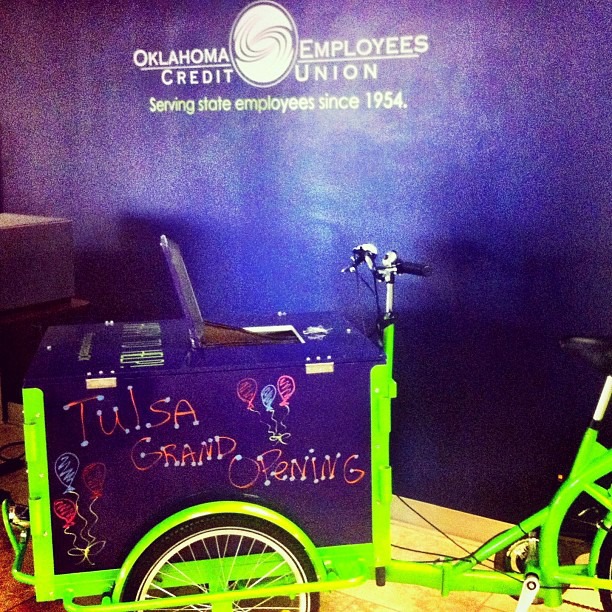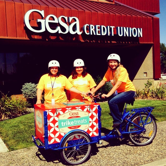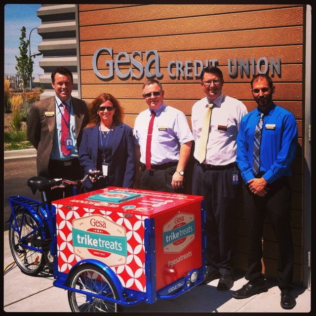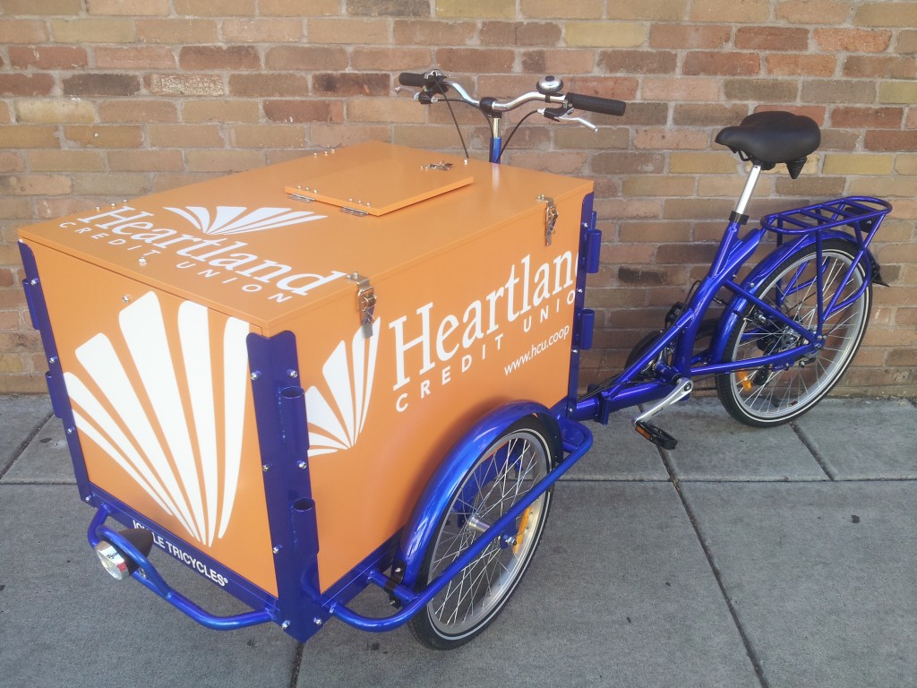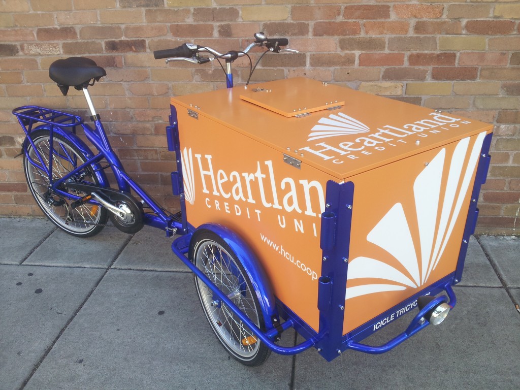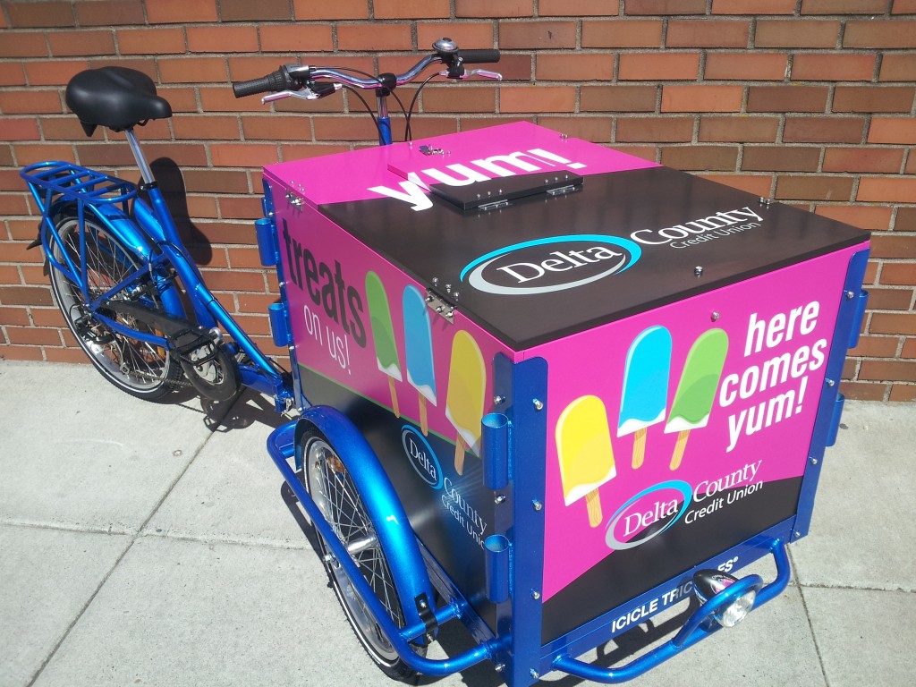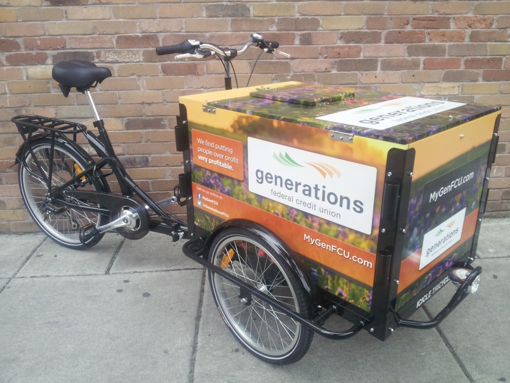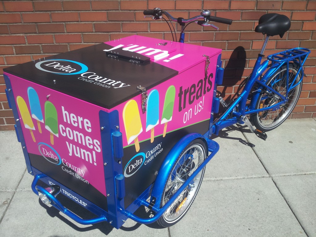 Why be stuck inside waiting for the neighborhood, when our bikes can roll right up to the neighbors! Icicle Tricycles is well versed in building custom credit union and community bank bike fleets, helping you get your credit union or community bank logo and graphics onto your new bike.